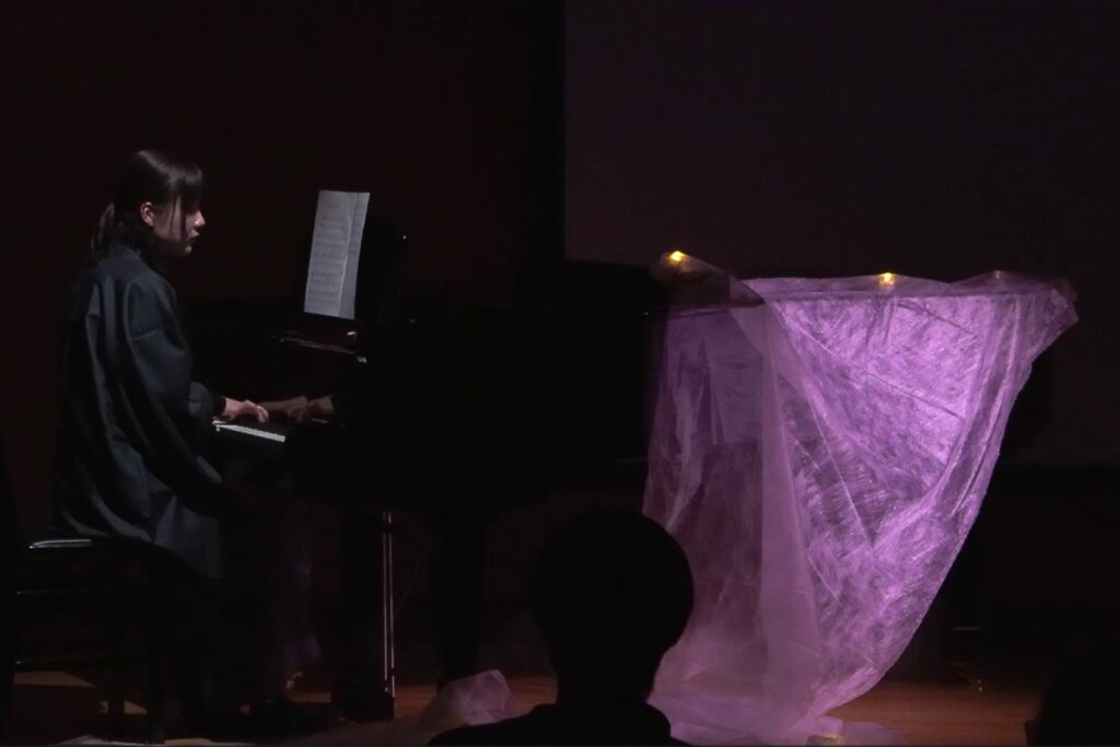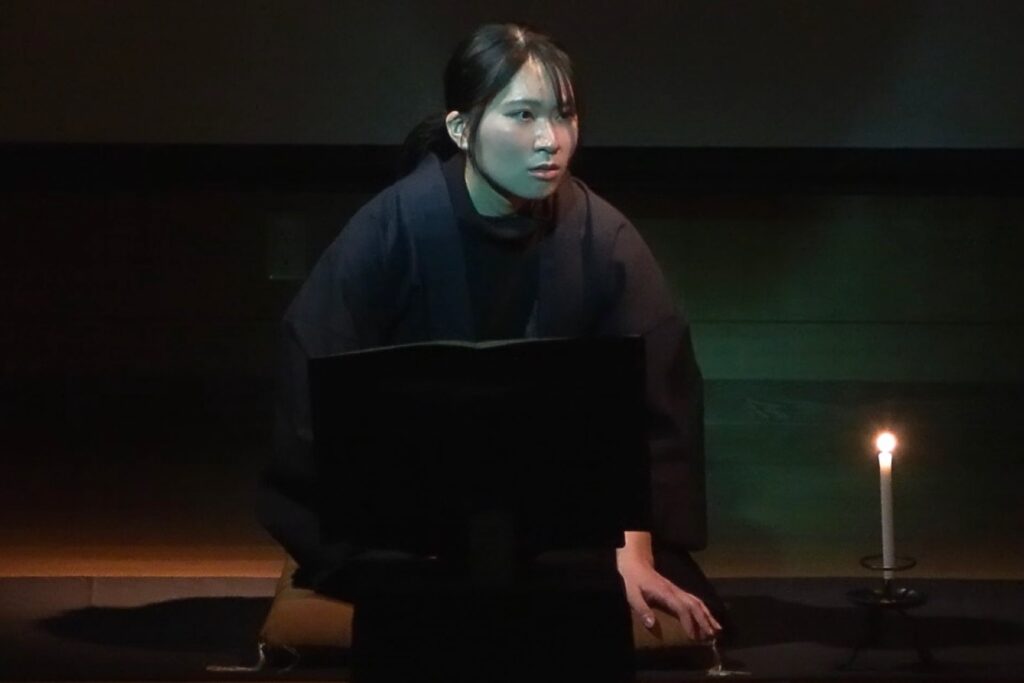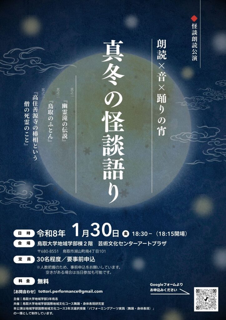 この公演は2026年1月30日(金)放課後に、鳥取大学芸術文化センターアートプラザにて行われた。鳥取の怪談話を、音楽や身体表現を交えつつ朗読するという構成だ。これは地域学部国際地域文化コース3年次後期の選択授業「パフォーミング・アーツ実践(身体表現)」の一環で行われたものである。10月当初集まった受講生は、各々異なるバックグラウンドを持っていた。演劇サークル所属の私、学内外での演劇経験がある柳瀬梨帆さん、作曲や楽器演奏が得意な竹内千乃さん。そのほかにも受講生はいたが、最終的に公演本番までを共にすることとなったのが、柳瀬さんと竹内さんである。
